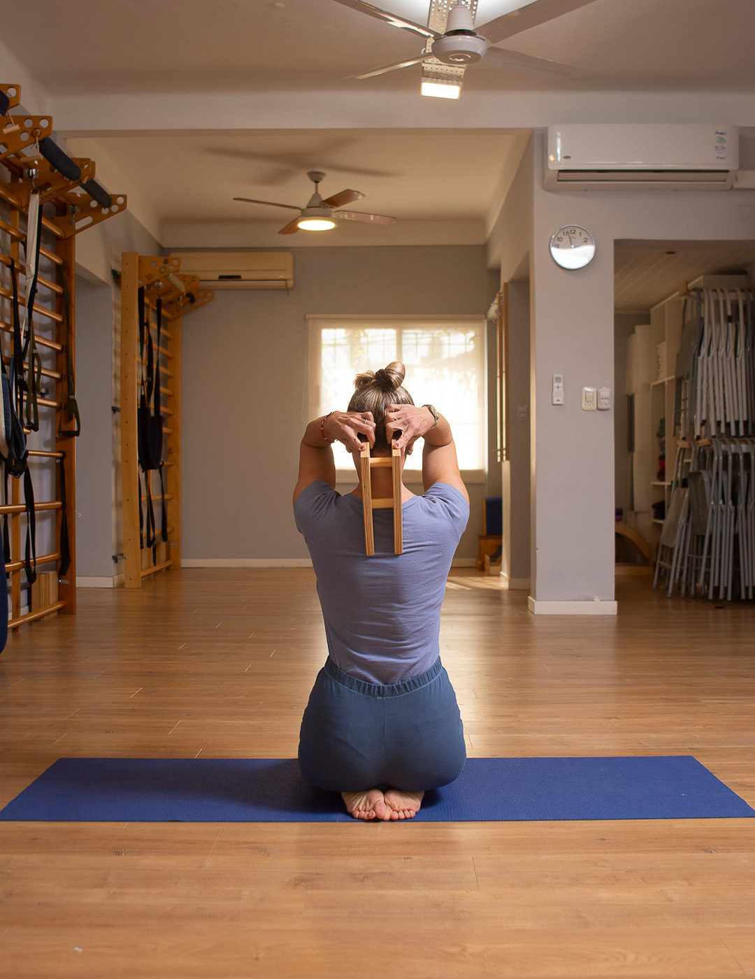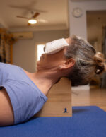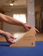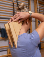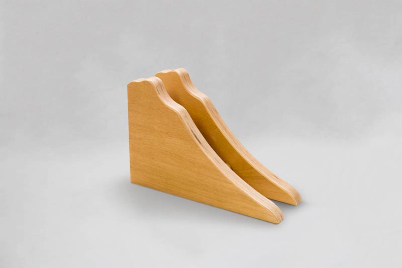 Soporte hecho en multilaminado de Guatambú, diseñado para el tratamiento de los dolores de cabeza producidos por contracturas del trapecio o tensión de los músculos de cuello y espalda.